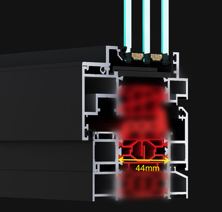 NARUSI纳努斯系统门窗,隔热条宽度44mm大于型材总宽度的一半以上,高阻隔热,隔绝热量传播,抗剪切力更强,其隔热性能也会更优秀,使室内冬暖夏凉,不浪费能耗,更节能。